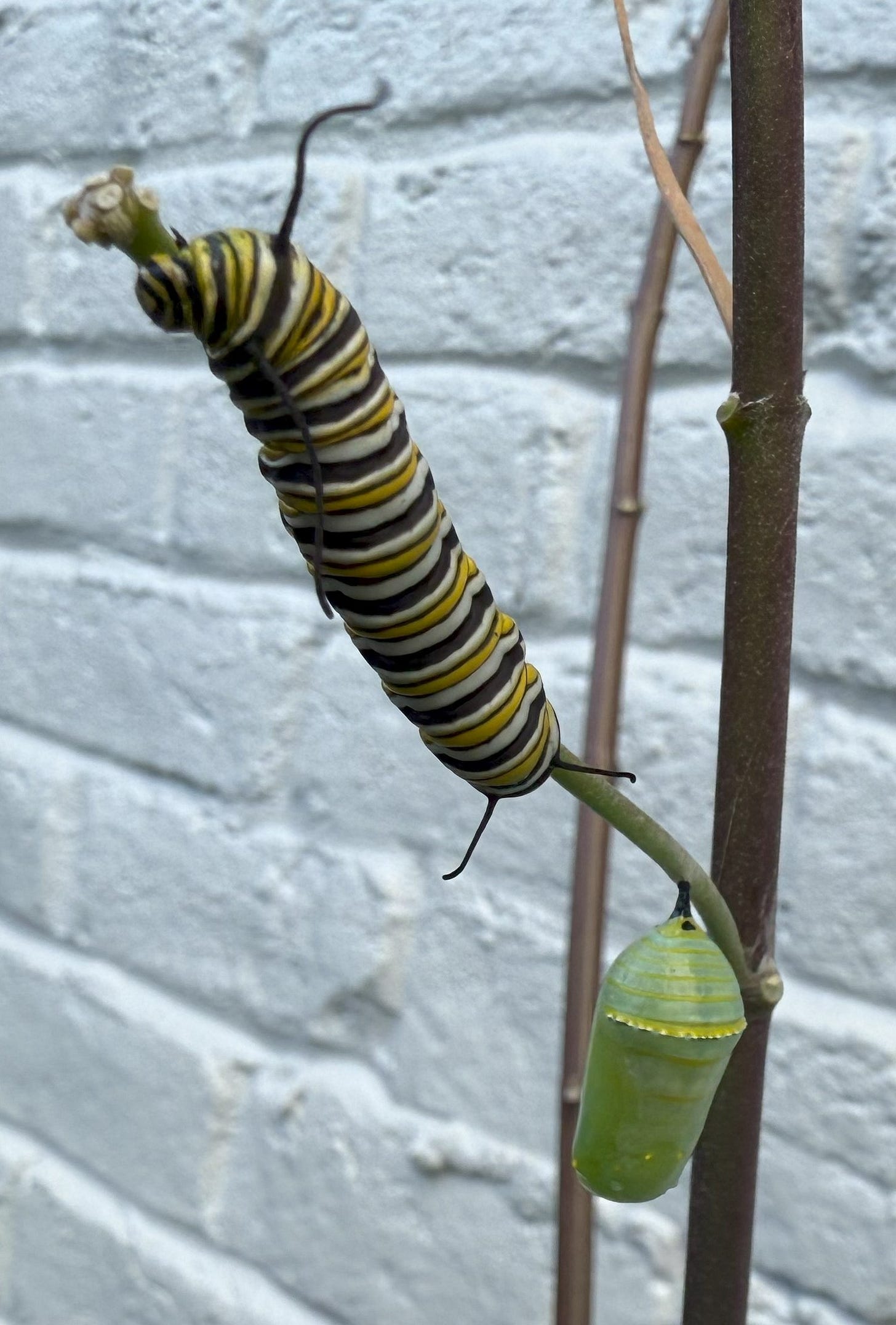 Today I spent probably 3 hours sitting in my back yard just watching the monarch caterpillars and butterflies. The reason I pulled up a chair and just sat there was because two of the caterpillars where in the “J” formation ready to become chrysalis and I have NEVER see this process in real life. First one I missed the first couple of seconds and man does it go fast. The second one I caught from the “beginning" - the point where the outer shell breaks open to be shed and the chrysalis emerges. It was so cool. The shell split right up the middle from the bottom going up. As it wiggled and wiggled around the shell worked it’s way up (like tube socks that fall to your ankles) until it was all crushed into this little bitty pile of black stuff. The chrysalis kept going side to side because it was annoyed that the shell hadn’t fallen away just yet and then when it did final fall the chrysalis calms down and got to the business of the next phase.